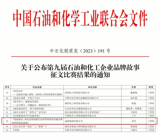 10月27日,中國石油和化學工業(yè)聯(lián)合會發(fā)布第九屆石油和化工企業(yè)品牌故事征文比賽獲獎名單,道恩集團參賽的文稿類作品《創(chuàng)新驅動、綠色發(fā)展,道恩打造世界級綠色低碳高端新材料制造基地》榮獲三等獎。